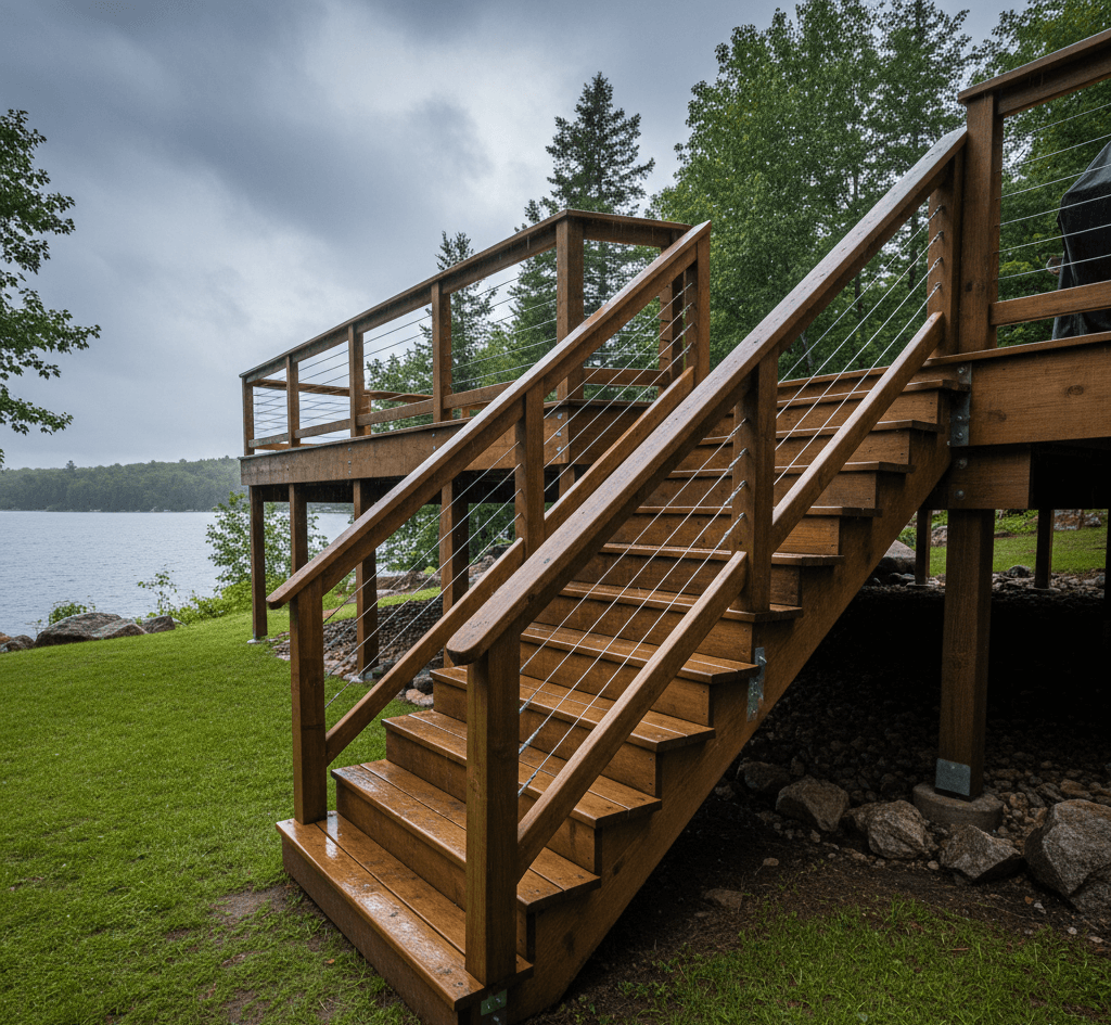 Heavy-duty treated wood decking with reinforced stair system construction. Built to endure harsh weather conditions, our deck and stair systems deliver lasting outdoor living spaces.
